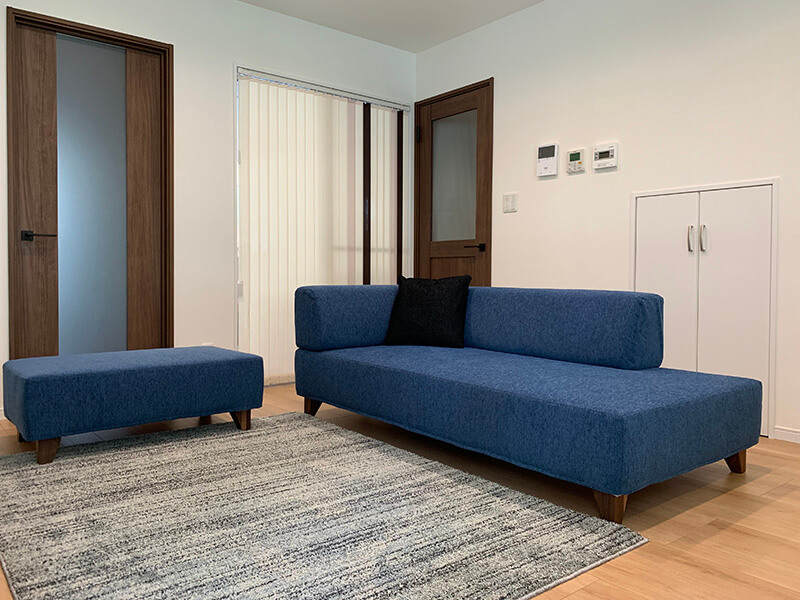 カラーは、お部屋がシンプルになり過ぎないようにネイビーブルーを選択。ウォールナットと相性抜群です!