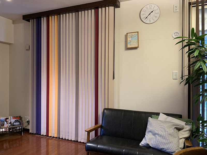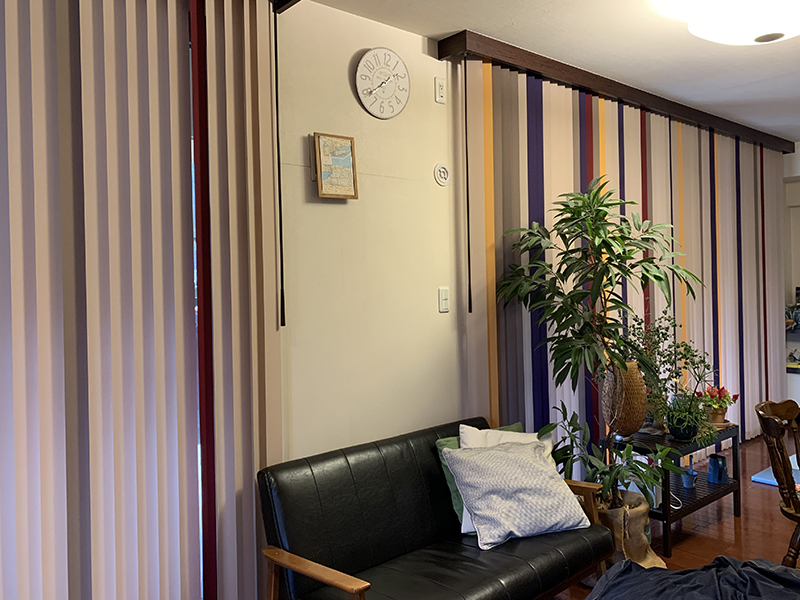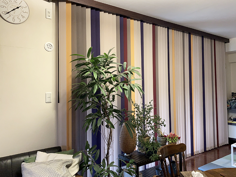 今回は、10年ほど白色のロールスクリーンを使っていたのですが、最近破れや壊れて動かなくなってきたということで、2窓分をバーチカルブラインドに取り換えさせていただきました。今までの真っ白に比べて、今回はミックスカラーにして、壁に彩りを入れることにより、お部屋が華やかになり明るくなったような気がします。