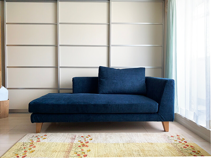 ソファ選びのポイントは、サイズで選ぶのではなく横になったり、あぐらをかいたりできる最低限の広さがあると良いかと思います。また、小さいソファにしてお部屋を広く見せるのではなく、アームレス(肘ナシ)ソファや背もたれが低いローソファなどの圧迫感をなるべく出さないデザインを選ばれると快適に寛げれると思います。