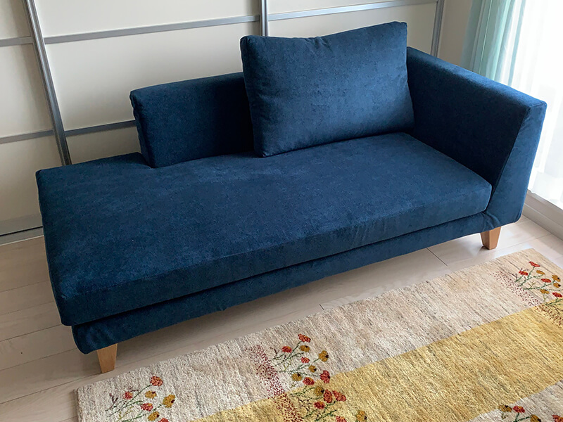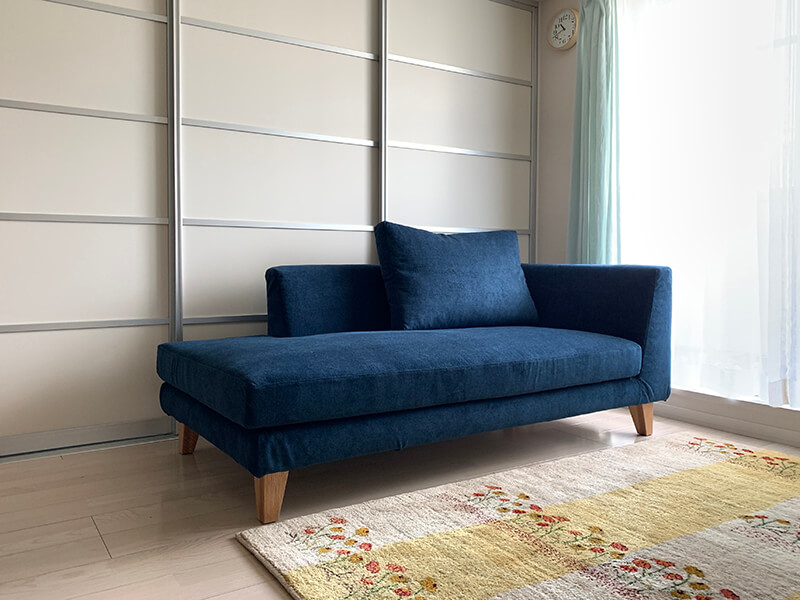 今回のソファは、W183cm のコンパクトサイズの『STYLE-TE』ソファです。片肘のカウチタイプは両肘のソファに比べ圧迫感がほとんどありません。また、くつろげる広さが思った以上にあります。肘のほうを頭にして横になると、ストレスなしで脚を伸ばして寛げれたりいろいろな姿勢で楽しみます。