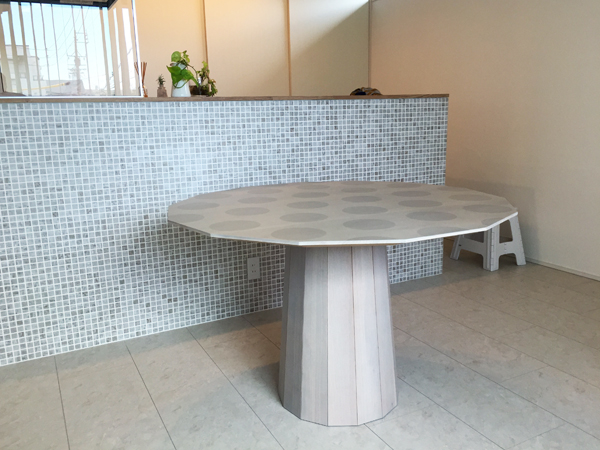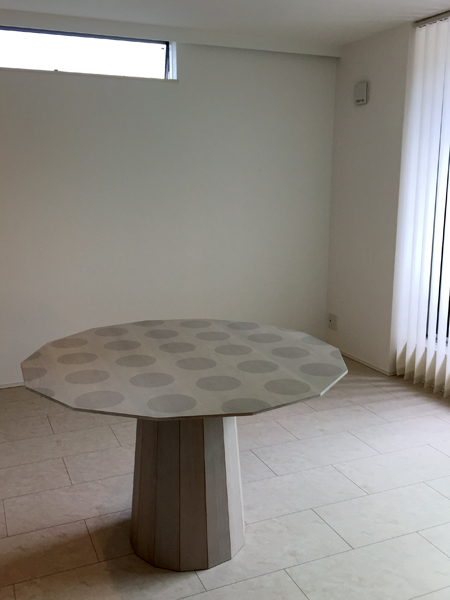 オランダ人デザイナー:ショルテン&バーイングスによる14角形のテーブルで、天板は淡いグレーに印象的なドット柄がプリントされたデザイン。樽状に木材を組み合わせ特徴的な脚形状をつくり出しています