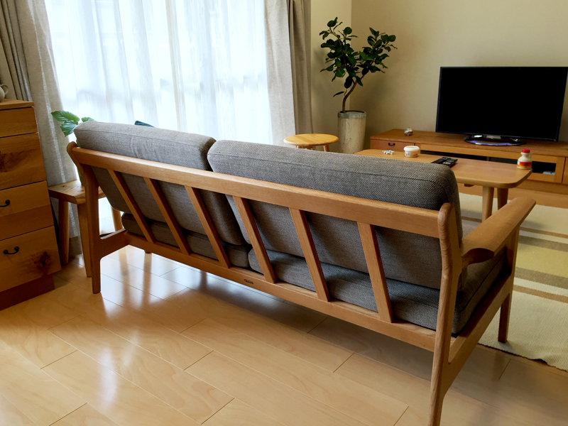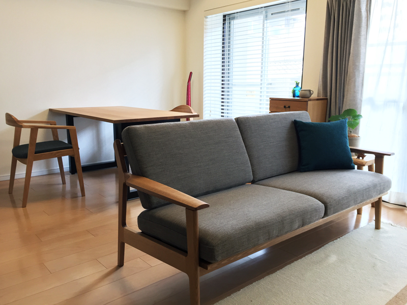 ソファには、コンパクトなウッドフレームソファを置きました。