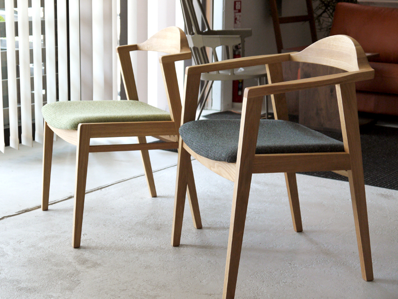 ご主人様はゆったりと寛げるようにアームチェアのグレー色、奥様は立ち座りがしやすいようにアームレスチェアのグリーンで、お互いデザインもカラーも違うものにして個性を出してみました。