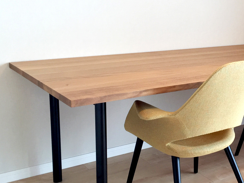 天板はホワイトオーク無垢材を仕様してナチュラル感をだし、脚は異素材のブラックスチール丸脚でスタイリッシュですっきりとしています。圧迫感もありませんね。