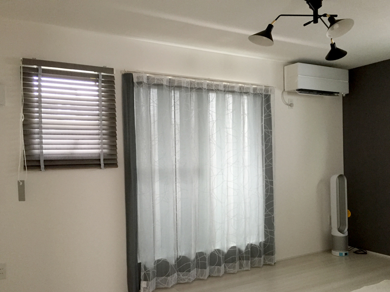 小窓には、カーテンや壁紙の色に合わせてグレーのウッドブラインドにしました。