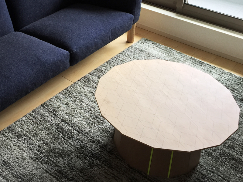 樽のような脚と15角形の天板が特徴的なテーブルは、どことなく親しみを感じる姿をしています。