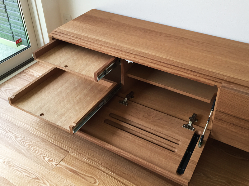 右側は引き出し2段にして、中央は深めの引き出しに左右移動可能な浅いトレーにし小物も収納しやすいデザインにしました。