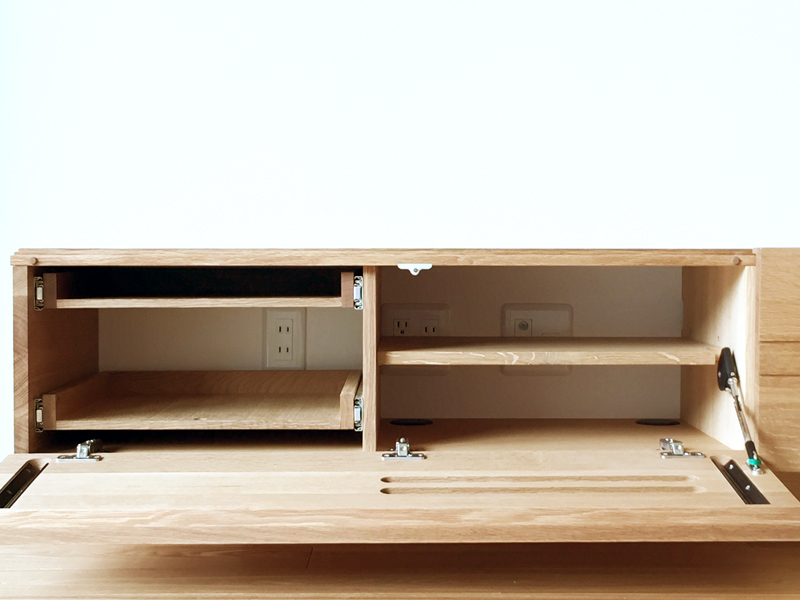 左側収納はAV機器と2段スライドトレーを作成し、上段にノートパソコン、下段にプリンターを収納できるスタイルにしました。