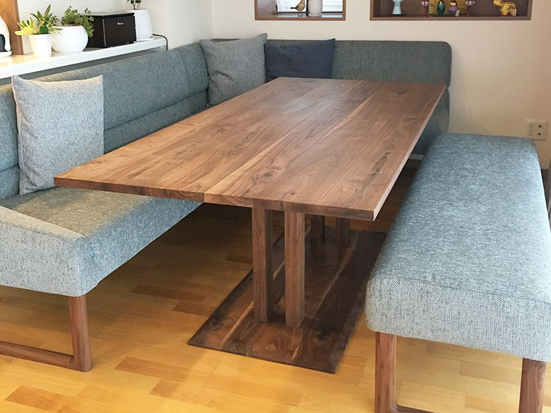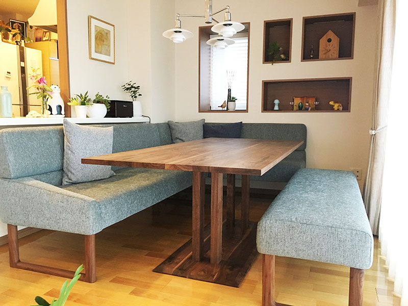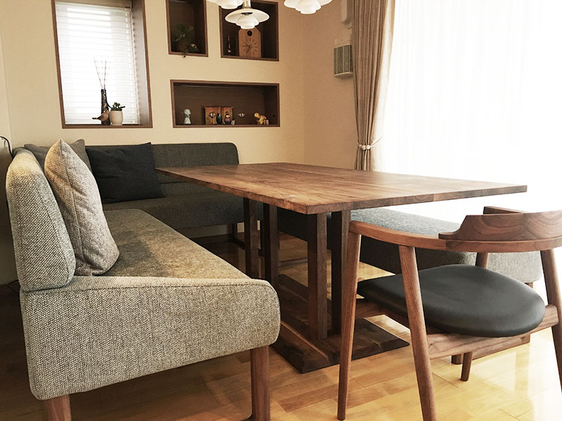 テーブルは、出入りがしやすい脚が中央にある『PIERNA』ダイニングテーブルを使用。素材にもウォルナット無垢オイル仕上げを仕様した経年変化を楽しめる仕上げにして、永く安心して使えるものにしました。