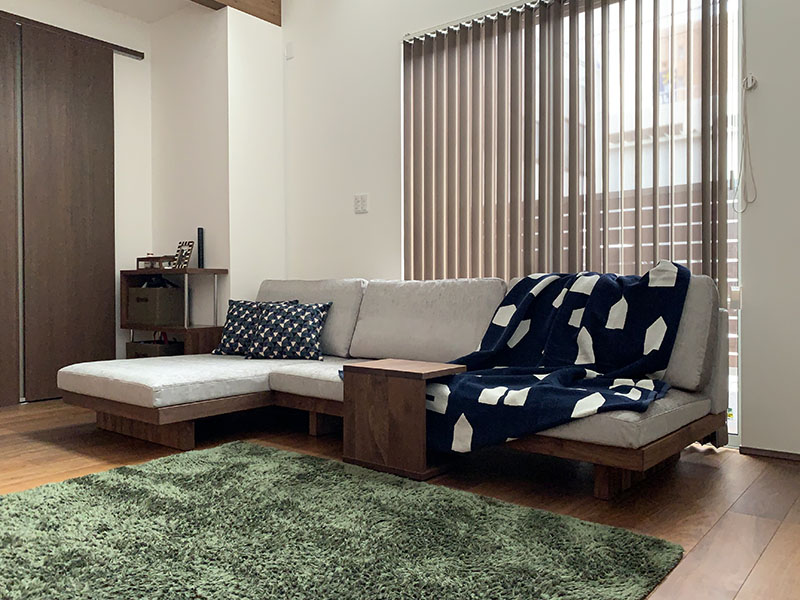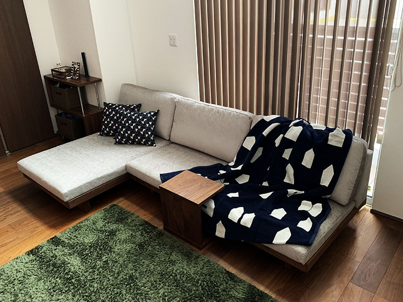 ソファの前には、子供が遊べれるようにテーブルは置かず、ちょっとコップが置けるサイズのサイドテーブルのみを設置。