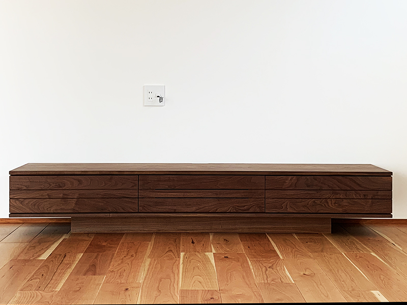 今回は、当店でも人気の『LINEA』TVボードW200cm H34cmタイプです。LINEAの特徴は置き型タイプですが、台輪が奥に入れ込んであるため宙に浮いている様なデザインにしておりすっきりとした印象の他にないTVボードです。。もちろん掃除ロボットも入ります。大きめな60~70インチのTVにも対応できるように横幅は最大300cmまで製作可能です。