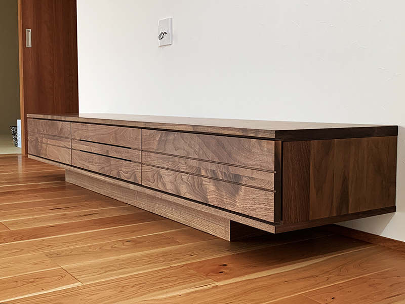 前面は扉が3枚に分かれていますが、端から端まで一枚の板を仕様しているため木目は繋がってきれいに見える木目通しで製作しています。