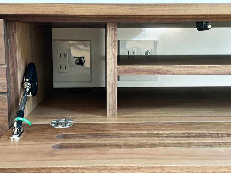 テレビボード裏のコンセント位置や配線などを考慮して、レイアウトを作成できます。壁面に隙間をつくることなくぴったりと設置できます。今回納品のお客様もTVボードの寸法に合わせてコンセント位置を取り付けてピッタリ!