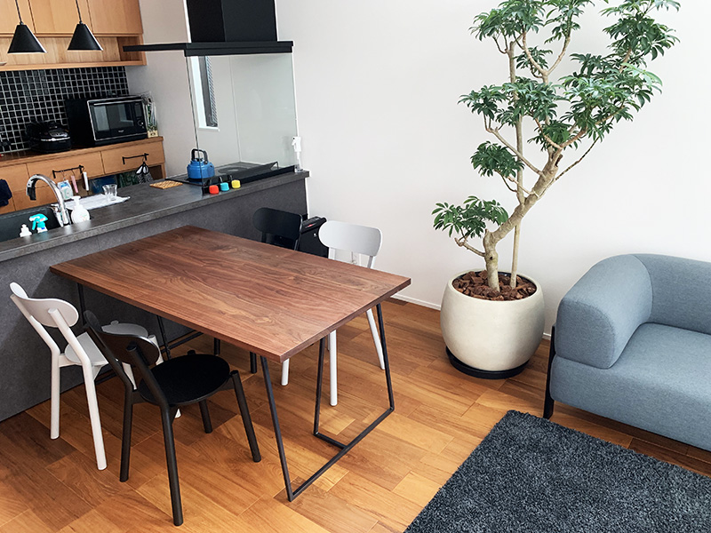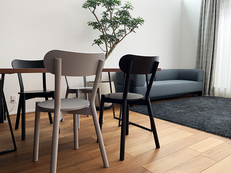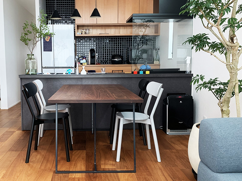 ダイニングはブラックアイアン脚の『SUMI Dining Table』。一般的なアイアン脚とは違い、細くて丈夫な鉄無垢を使用。15mm角の脚は椅子のデザインをきれいに見せてくれます。椅子もソファと同じカリモクニュースタンダードの『キャストールチェア』シンプルでありながら無駄のない曲線がきれいなデザインです。あまりカジュアル過ぎないように、ウォールナット無垢の天板で高級感を演出してくれて、キッチンとの空間にも自然と溶け込みます。