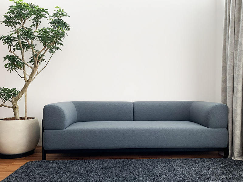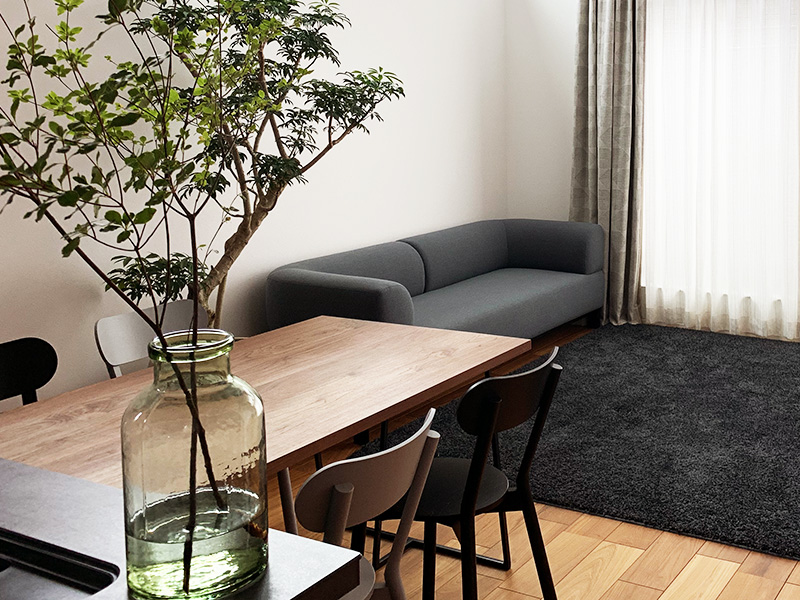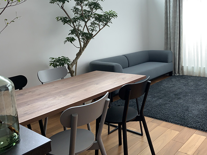 お部屋に入ると、大きな窓から入る日差しと大きな観葉植物がなんとも気持ちよく感じるLD空間。この空間にエレガントさを兼ね備えた、カリモクニュースタンダードの『エレファントソファ』がピッタリと納まる。ブラックフレームにマハラム社製の張地『モード』のブルーグレーが映える。