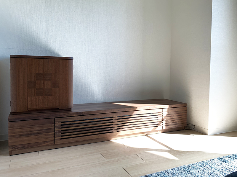 TVボードはロータイプにして圧迫感をなるべく抑えたデザイン。TVボードの上に、コンパクトサイズの仏壇を設置。ボードの素材と合わせいるので、扉を閉じてしまえば重苦しい仏壇にはぜんぜん見えません。