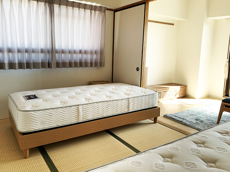 隣の和室にはシングルベッドを2台設置。ヘッドボードをなくして圧迫感をなるべく抑えています。