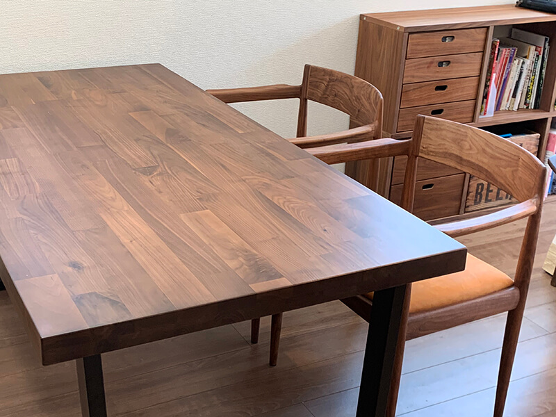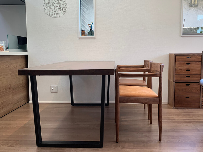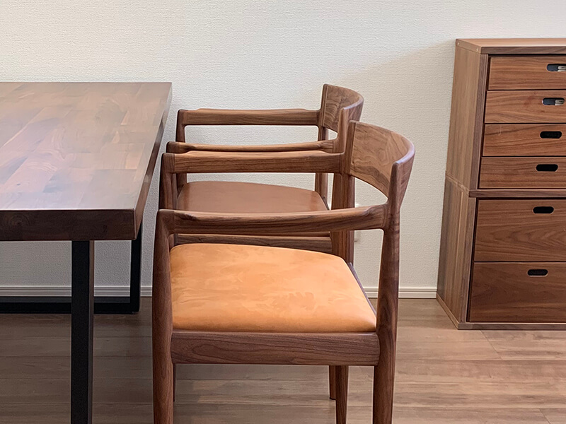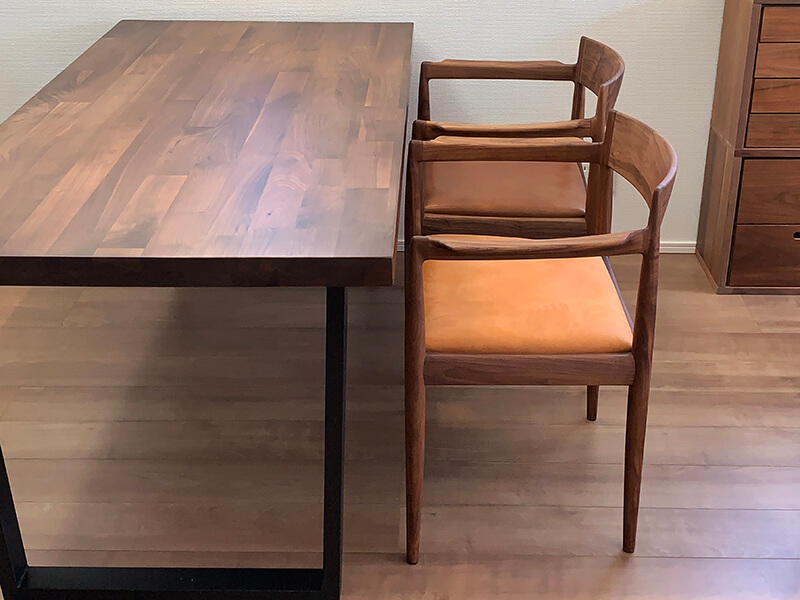 今回は座面を本革仕様でお互い好きなお色目で作製しました。座面と同様にウォールナットの蜜蝋仕上げにして、使い込むほどに味わいが出てくるのを楽しめます!