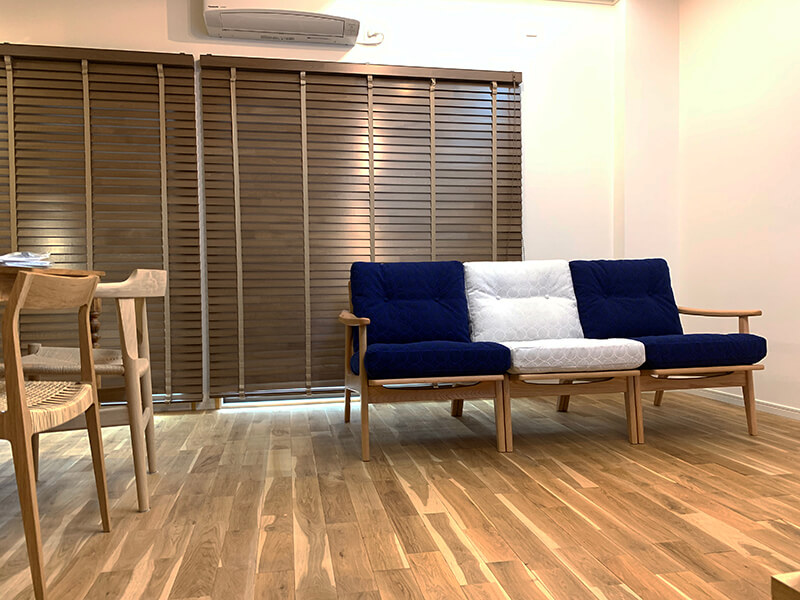 オーク材の家具や建具の中に、マルニ60ソファとミナペルホネンのタンバリン柄ブルー&ホワイトが一層引き立ちます。