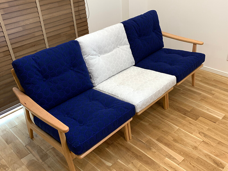 マルニ60ソファに特別生地ミナペルホネンのdopタンバリ柄ブルー&ホワイト生地で納品させていただきました。