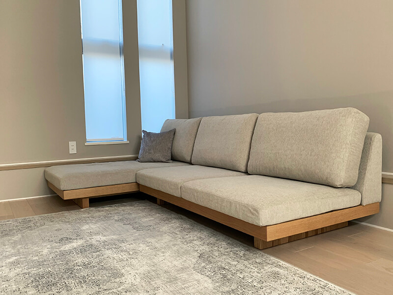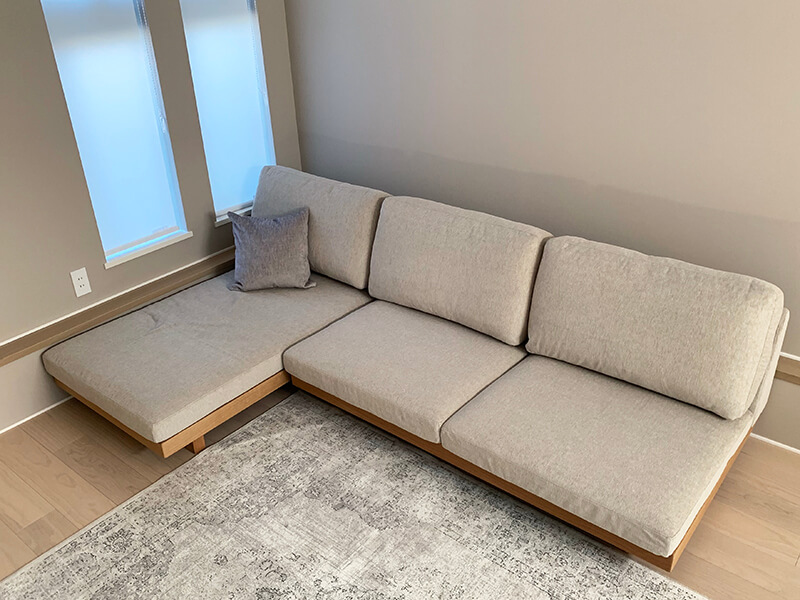 名古屋市中川区H様邸・ソファ 2021.01.30 納品レポート 低い座面にゆったりくつろげるDanishコーナーソファ 今回は、リビングが約30㎝低いスキップフロアにソファを設置しました。このデニッシュソファもロータイプでアームレスのため、ほとんど圧迫感もなくすっきりおさまり間取りにぴったりです。フレームはホワイトオーク材に布地はベージュ色のナチュラルな雰囲気になりました。 H様、この度はご購入いただきましてありがとうございました。