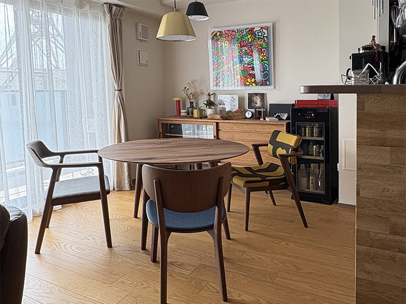 キャビネットの上の小物や壁面アートとの相性も抜群で、家具とディスプレイが互いを引き立て合う空間に仕上がりました。色や柄・素材のバランスが心地よく、日常のダイニングに彩りを添えてくれます。