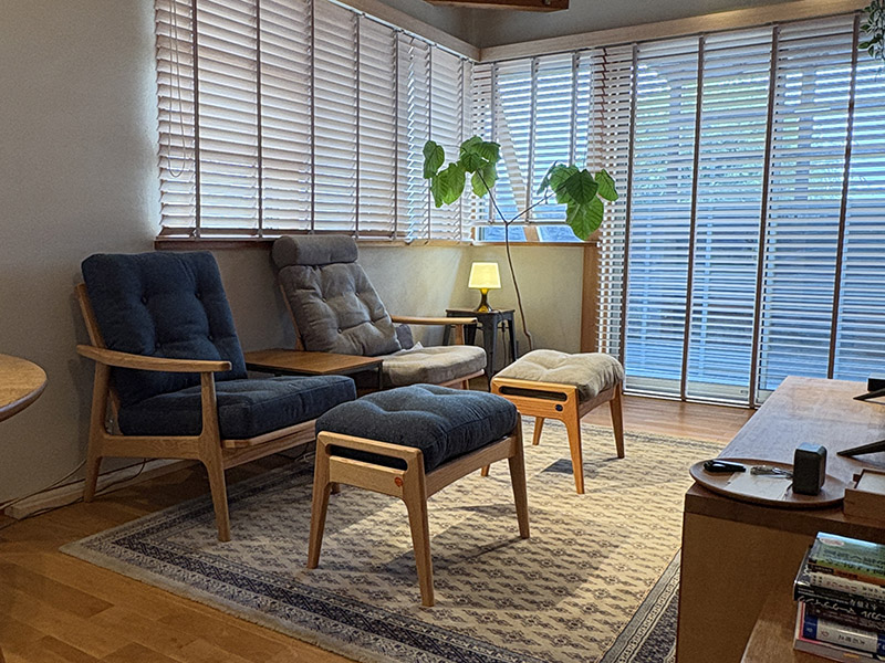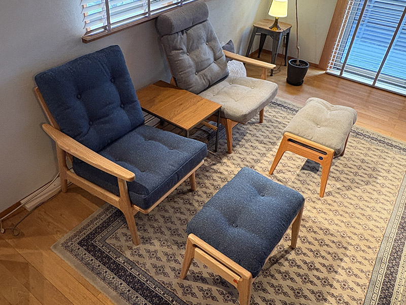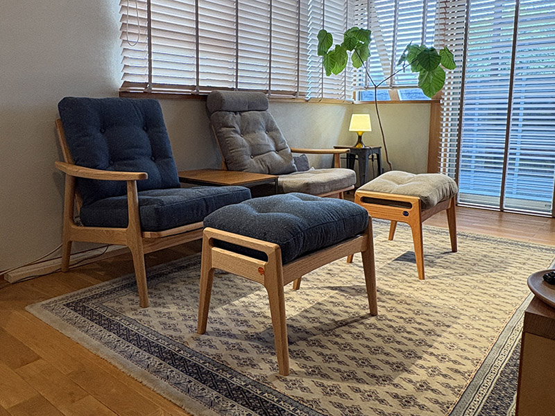 ハイバックタイプならではのゆったりとしたクッション性と、端正な木部のラインが美しい「マルニ60フレームチェア」。置いた瞬間に空間の”質”が一段上がったような、そんな佇まいです。色違いのクッションで統一感の中にも軽やかな遊び心が生まれ、リビングの空気がより柔らかく、心地良く整いました。