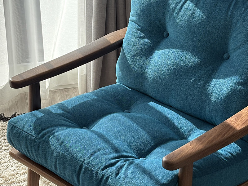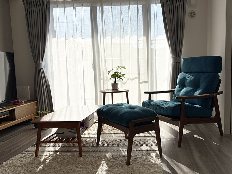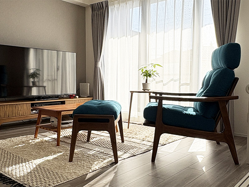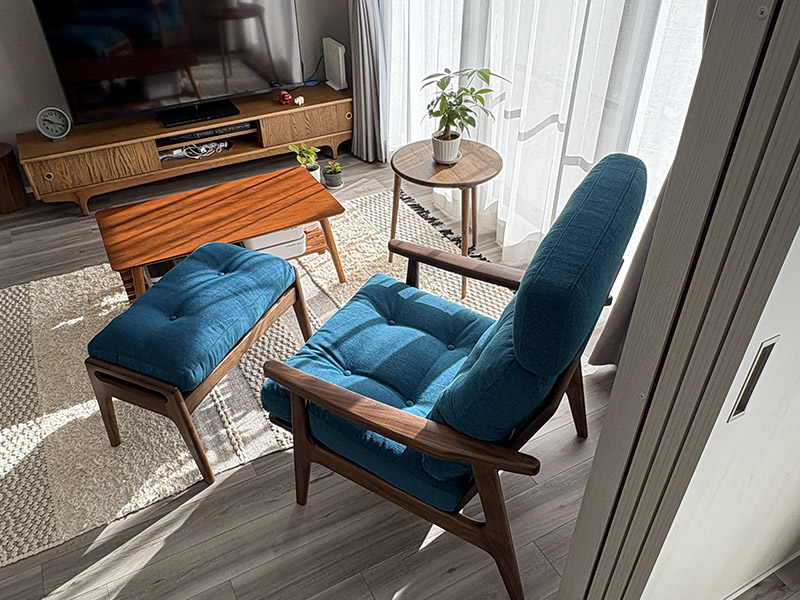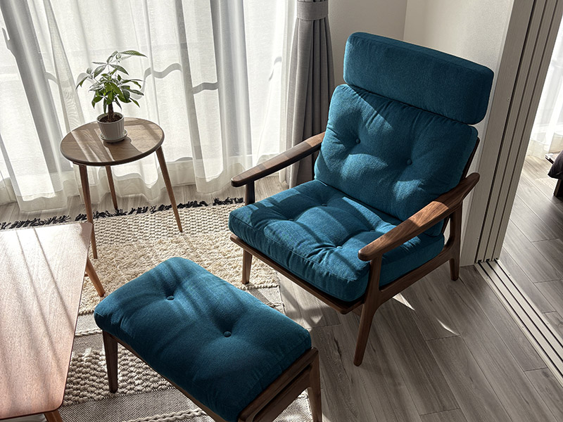 ウォールナットの温かみと、深みのあるブルークッションが美しく馴染む「MARUNI60」フレームチェア。ワイドタイプにヘッドレストとオットマンを合わせることで、より深いくつろぎへ。読書やコーヒータイムが特別な癒しの時間に変わります。