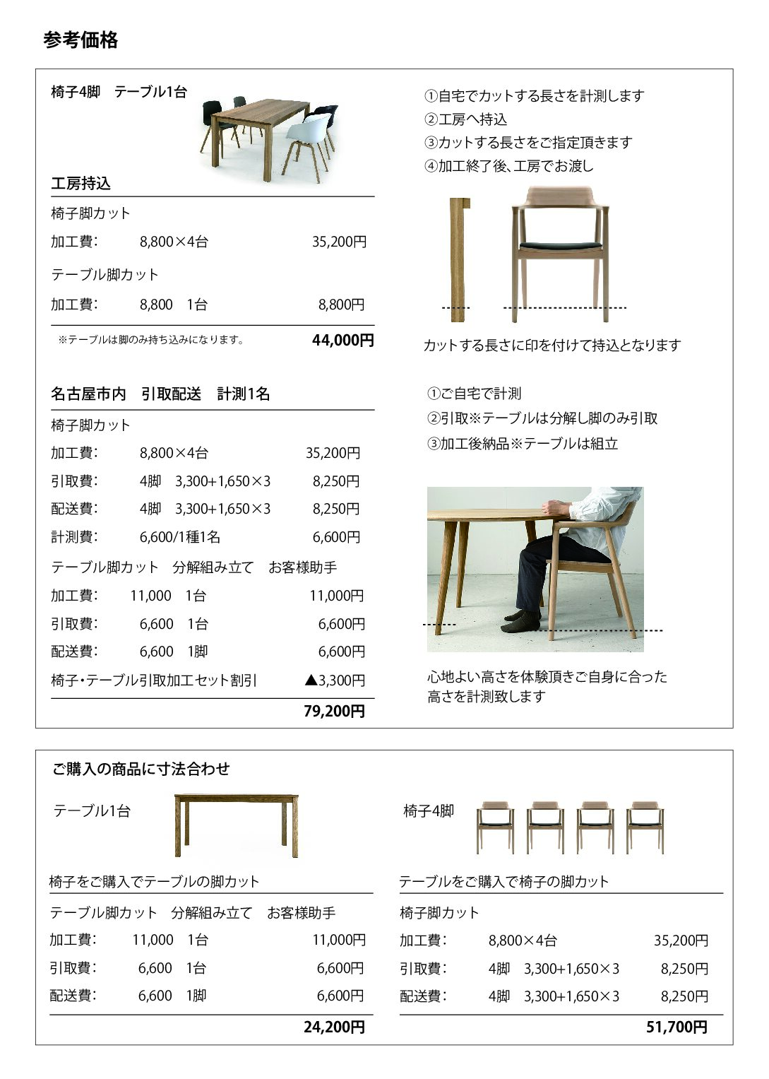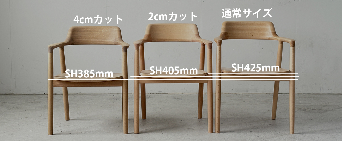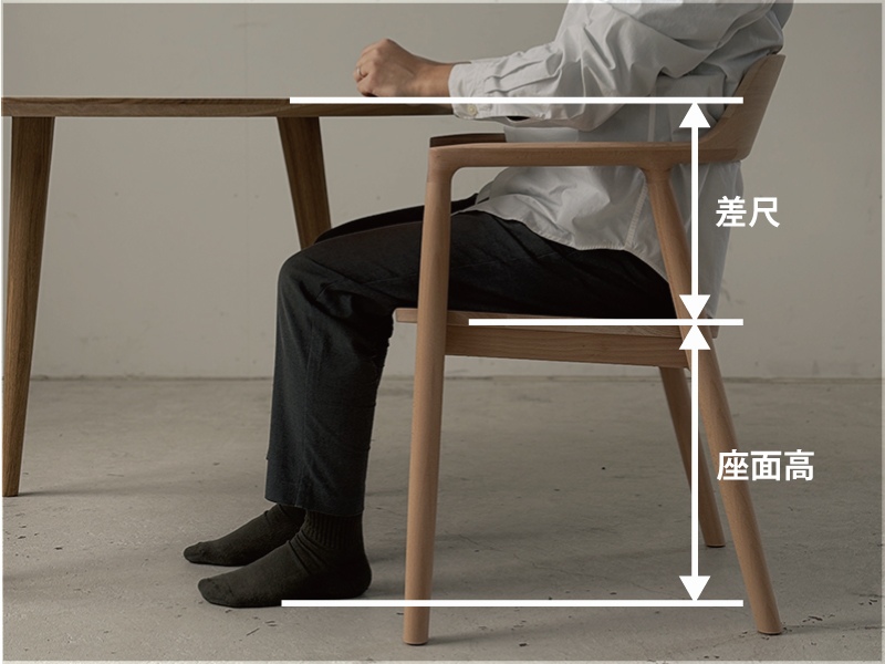 椅子選びにおいて「座面の高さ」は、とても重要なポイントです。座面高さが合っていないと、長時間座ると疲れやすくなったり、姿勢が悪くなったり、腰や膝に負担がかかったりと身体に悪影響を及ぼす可能性があります。 一般的に販売されている椅子は誰に合わせて作っているの? 日本のダイニングチェアは、日本の男性の平均身長(約170cm)くらいを想定して製作しているのが一般的です。座面高さは、約42cm前後が多いと思います。 ※ちなみに日本の女性の平均身長は157cmです。 小柄な方が座ると? では、小柄な方が一般的な座面高さで座るとどうなるか? 床に足が付かなかったり、かかとが浮いたりする。また、背中を付けずに浅く座ってしまう。 本来の正しい姿勢で座れていません。 座面が高いと・・・ 腿の裏が圧迫され回避するため座面の前方に座る。 アゴに力が入らなくなり、噛む力が15%ほど弱くなる。 骨盤が倒れた姿勢になり、腰痛の原因となる。 傾斜した状態を背中で起こすため猫背の姿勢になる。 デスクワークの際は、集中力がかけてしまう。 このことから、座面の高さが合っていない事が正しい姿勢で座れない原因の一つと考えられます。 では、正しい姿勢『かかとを床にしっかりつける』と? 1.体重を分散できる ・かかとが床に付いていると、お尻・太もも・ふくらはぎ・足裏の4点で体重を分散でき楽になる。 2.姿勢が安定する ・脚全体が床に付く事で、骨盤が立ち、自然なS字カーブの背骨を保ちやすくなります。 ・姿勢が崩れにくくなり、長時間座っていても疲れにくくなります。 3.血流がよくなる ・かかとが浮いていると、ふくらはぎの筋肉が緊張して血流が悪くなり、むくみや冷え性の原因に。 ・足をしっかりつけると、筋肉がリラックスして血行が良くなります。 つまり、かかとをつける=自然で健康的な座り方なのです! ダイニングを選ぶ際は、椅子から決めるのがおすすめ! 椅子は身体に直接ふれる家具だから、座り心地・座面高さ・フィット感が重要になります。身体に合った座面高さの椅子を、まず決めることによりテーブルの高さを決めやすくなります。 椅子とテーブルの高さのバランスとは? 椅子とテーブルを合わせるのに重要なのが、「差尺(さじゃく)」になります。差尺とは、テーブルの天板の高さから椅子の座面の高さの差のこと。椅子とテーブルの差尺が合っていないと、使い心地だけでなく、姿勢が悪くなり、肩こりや頭痛など健康被害を引き起こすことがあり非常に大事な事です。 差尺=テーブル高さ-椅子の座面高さ(体重が沈んだ際の高さ) 差尺の理想的な数値 一般的に、約27cm~29cmが快適とされています。 インテリアエッセンスではお客様の最適な座面高、差尺を計測し、一生満足いただける高さで脚カットが行なえます。 ※座高(身長×0.55)÷3)-2cm、座面高 (身長×1/4)等が見かけますが、あくまでも平均値で違う場合が多々ありますのでお気を付けください。1cm違うだけで全く心地よさが変わる体験を弊社では行っております。 ご依頼方法 □ 椅子脚カット ・脚カット 1cm単位でカット ※誤差±2mm ・対象 木製脚 (丸脚φ50mm 四角脚50mm以内) ・価格 工房持込:8,800円(加工費のみ) ・オプション 引取費: 1脚3,300円 2脚目以降1,650円/脚 名古屋市内 ・ 配送費: 1脚3,300円 2脚目以降1,650円/脚 名古屋市内 ・ 計測費: 座面高・差尺 6,600円/1種1名 □ テーブル脚カット ・脚カット 1cm単位でカット ※誤差±2mm ・対象 木製脚(丸脚φ50mm 厚み50mm W300mm)※フラッシュ構造は出来かねます ・価格 工房持込:11,000円(加工費のみ)ストレート脚価格 ※形状により見積 ・オプション 引取費: 1台6,600円 ※作業員1名 2名必要な場合+2,200円 名古屋市内 ・ 配送費: 1台6,600円 ※作業員1名 2名必要な場合+2,200円 名古屋市内 ・ 計測費: 座面高・差尺 6,600円/1種1名 ・※上記以外は別途見積にてご案内いたします □仕上げ 面取り加工 ※オイル塗装のみ希望により塗布いたします。 オプション フェルト剥がし:1台550円 フェルト貼り:1台440円 注意事項 ・脚切断時の欠け 貼り付け補修無償で行います。 ・脚切断時の割れ 木部の劣化や反りなど、目視出来ない内部の割れが脚カットにより現れる場合があります。可能な限り無償で補修致します。 ご注文の流れ ご依頼の詳細を確認をさせていただき、担当よりご案内いたします。 下部の【脚カット申し込みはこちら】よりお申し込みください。 お申込み時に必要な情報は以下になります。 ・お客様情報(お名前・ご住所・電話番号・メールアドレス ) ・依頼品の情報(依頼内容・個数・商品寸法(巾・奥行・高さ・カット寸法)) ・お預かり・お渡しについて(工房持込・引き取り、工房渡し・ご配送) ・画像添付(真正面・真横・前方より斜め上) 脚カット申し込みはこちら入力フォーム
