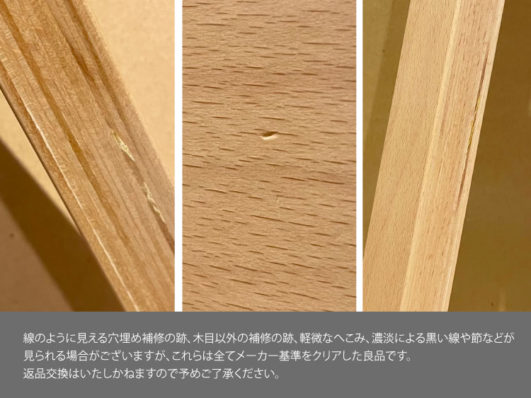 自然素材をふんだんに使用し、木材の長所である固有の木目を活かした製品になります。そのため、1点1点大きく異なり色の濃淡や木目の違い・節(ふし)などがありますが、品質には問題ございません。また、以下の画像のように線のように見える穴埋め補修の跡、木目以外の補修跡、軽微なへこみ、濃淡による黒い線や節などが見られる場合がございますが、これらは全てメーカー基準をクリアした良品です。品質不良以外での返品、交換は致しかねますので予めご了承下さい。