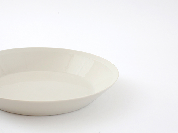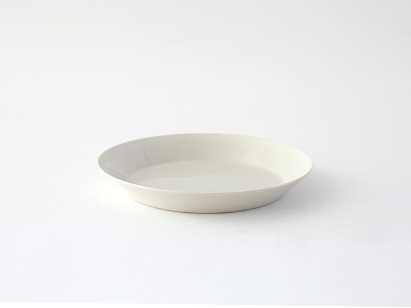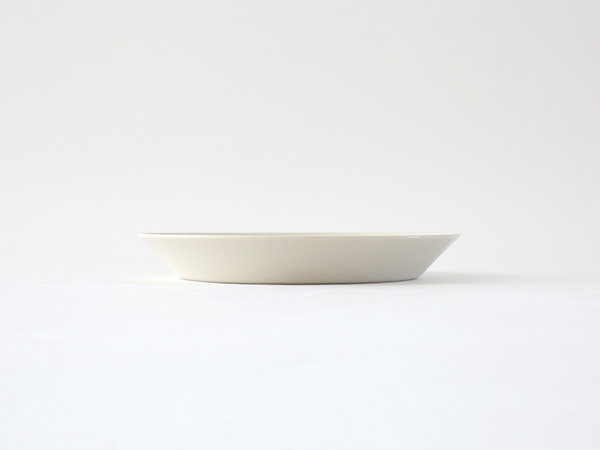 高台のないシンプルなフォルムでありながら、リムの立ち上がりや角度のわずかな違いが、盛り付けた料理の表情を豊かに演出します。フチ部分は釉薬がかかっておらず、白いラインがデザインのアクセントになっています。無釉ですが、丁寧に磨きをかけて仕上げているので、なめらかで心地よい手触り。汚れもつきにく日々の手入れが簡単です。こちらのプレートは、取り分け皿やデザートプレートにぴったり。パン皿としてもちょうどいいサイズです。 メインのおかずにも使い勝手がよく、リムがあるおかげで汁気のあるお料理も安心して盛り付けられます。高台が無いため収納時には重ねてすっきり収められる仕様で、機能性も兼ね備えています。