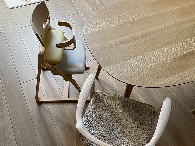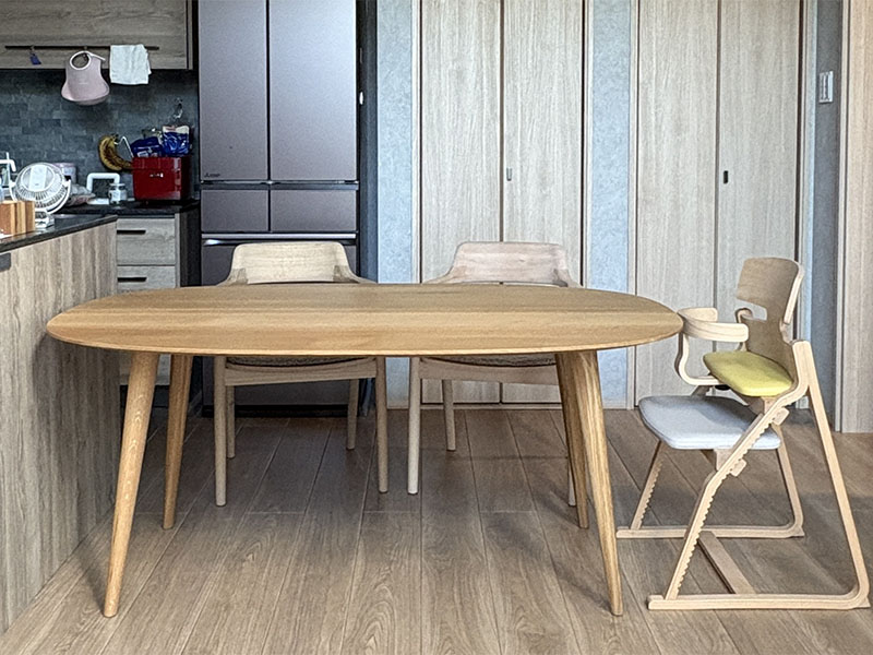 角がないので丸テーブルみたいに囲んで団欒もでき、お子様に寄り添いながらお食事もしやすくなります。また、動線も確保しやすいのもメリットです。