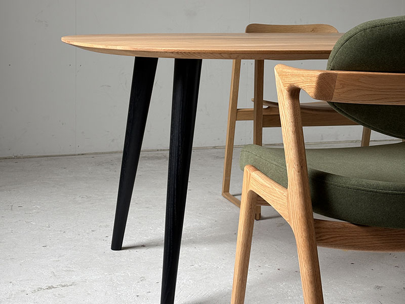 天板厚25mmの幕板がない無垢天板は、直線的なラインが描け、シンプルでスタイリッシュなミニマルスタイルを作れます。また、脚の位置を少し奥に入れているため、椅子の置き場所を制限しなく、座った時にもほとんど気になりません。