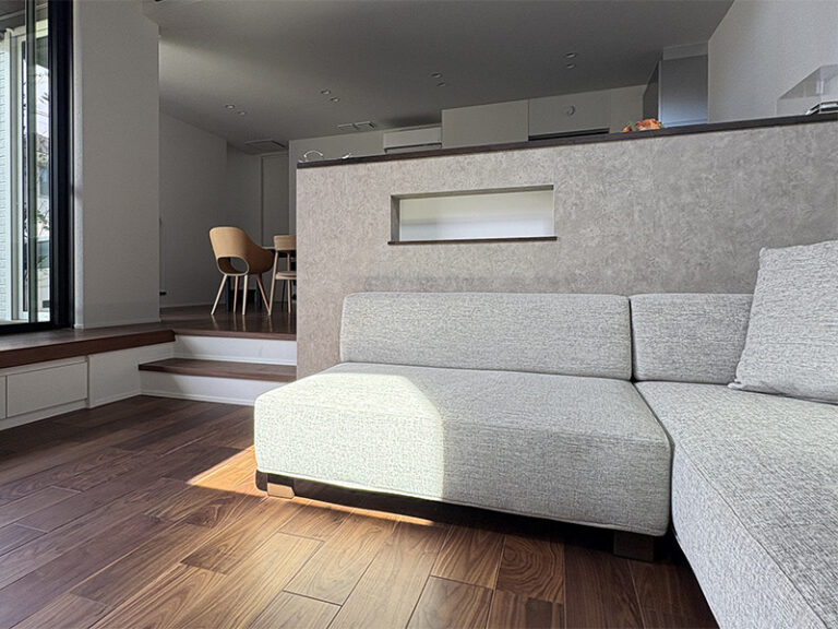 戸建・ソファ 開放感のあるリビング空間 玄関を開けると、ウォールナットの背面が美 ・・more