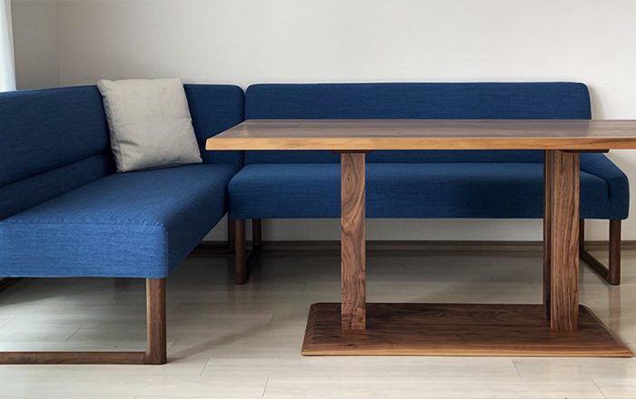 ソファとダイニングをひとつにまとめた今人気のソファダイニング。 ブルーの張地がス ・・more