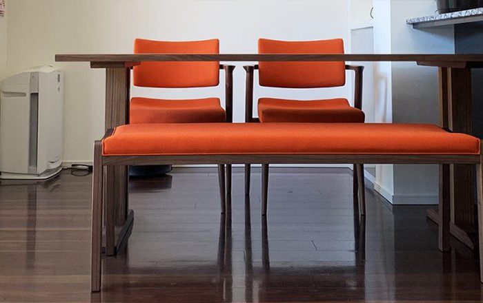 鮮やかなオレンジの色が映えるダイニング ウォールナット無垢材にこだわりテーブルは ・・more
